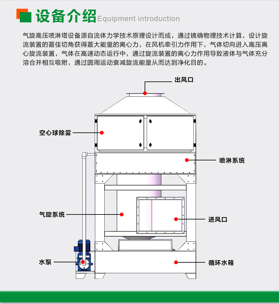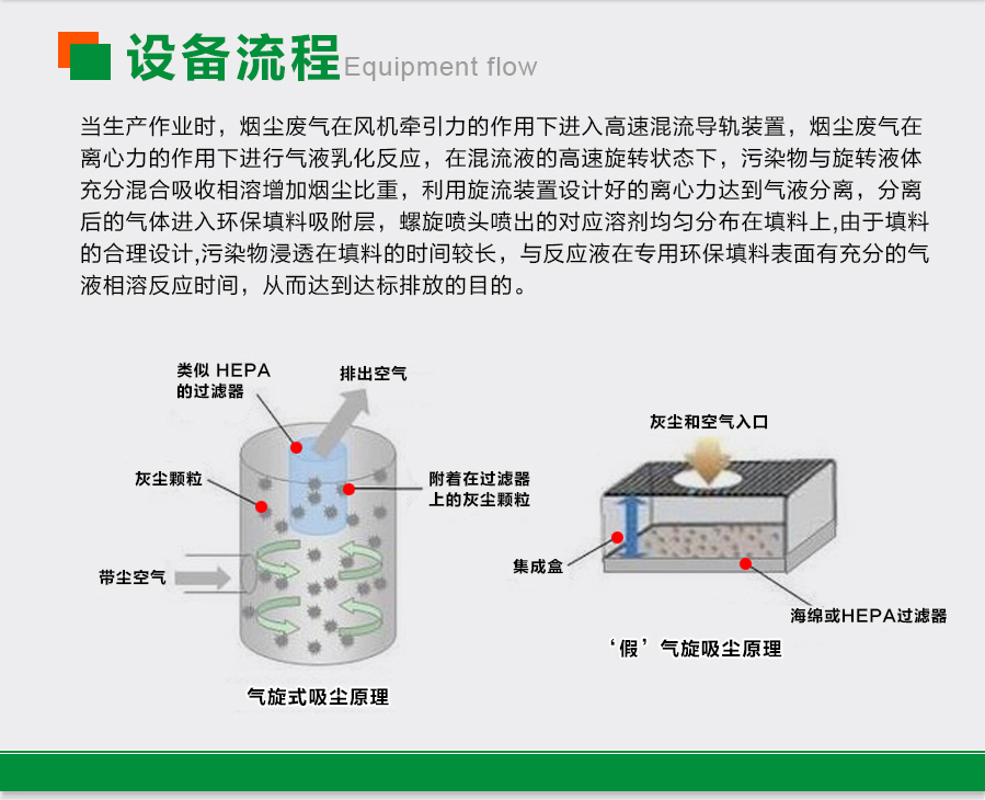 含塵含味氣體通過吸氣罩收集,在風機的作用下,經過管道輸送負壓進入雙級氣旋噴淋塔。氣旋混流裝置快速運轉,多級連續(xù)的凈化使得含塵含味氣體與水霧充份混合,在離心的作用下達到氣液分離。氣旋桶內部采用水泵循環(huán)給水,水在水箱經水泵增壓后自螺旋噴嘴霧化而出,最后回流至水箱循環(huán)使用。分離出來的雜物下沉到水箱底部,經凈化后的氣體進入填料隔水層,然后由風機排出。