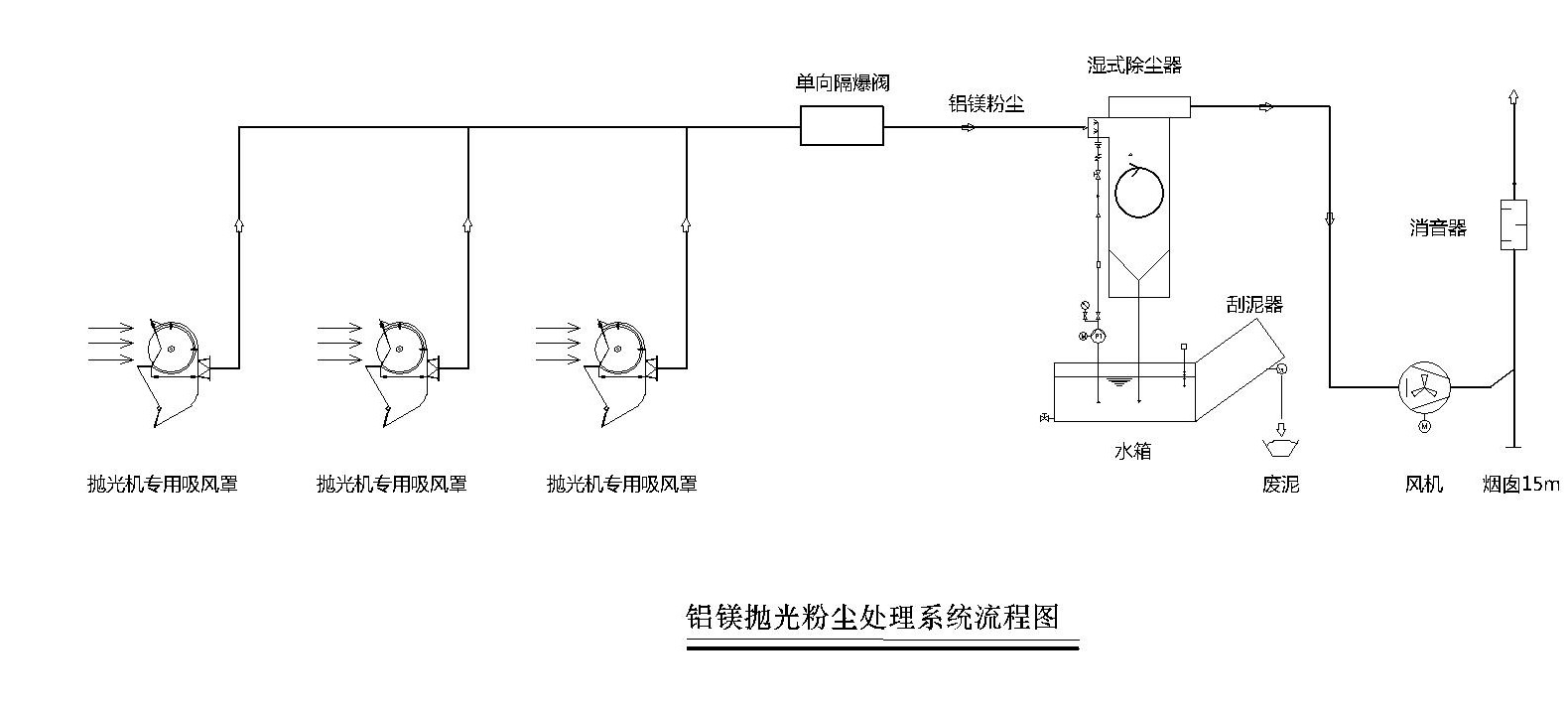 在原有的拋光機上設計專用的吸風罩,吸風罩有效捕集鋁鎂粉塵收集效率達到95%以上,粉塵通過管道輸送到濕式除塵器,再經(jīng)過濕式除塵器,粉塵顆粒物與水充分接觸,去除其中大部分顆粒污染物,去除效率高于95%,處理后的氣體可以通過室外煙囪直接排放到大氣中。