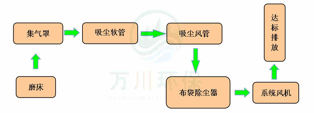 磨床生產(chǎn)時(shí)產(chǎn)生的粉塵通過集氣罩、吸塵軟管進(jìn)入到脈沖布袋除塵器中過濾凈化,粉塵落入灰斗,凈化后的廢氣通過系統(tǒng)風(fēng)機(jī)達(dá)標(biāo)排放。