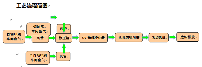因為該企業(yè)印刷機車間均為密閉車間,且已做排風系統(tǒng),但排風系統(tǒng)和小風機均為直排到高空和廠房1樓外部,影響到了周圍環(huán)境。經過我司工程師現(xiàn)場勘查,結合企業(yè)的實際生產情況,我們最終決定采用UV光解法+活性炭吸附法來進行處理。