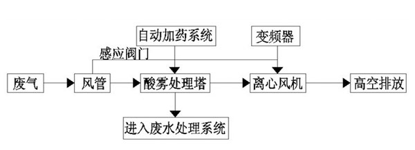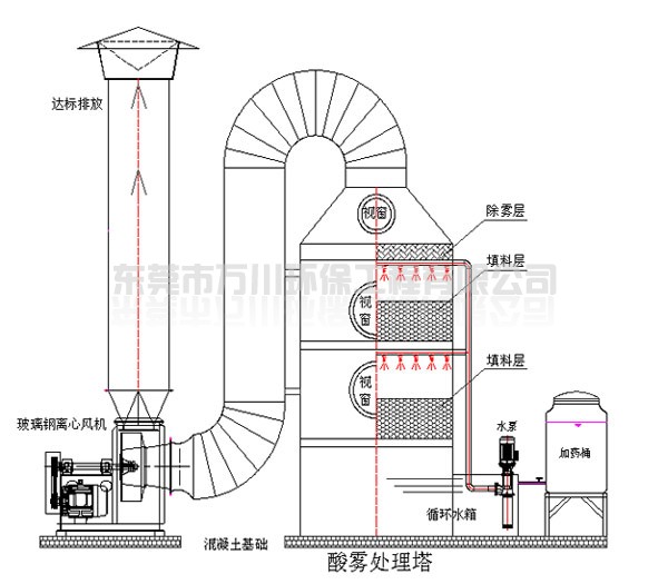 酸霧廢氣由風(fēng)管進(jìn)入酸霧處理塔,自下而上穿過填料層;循環(huán)堿液吸收劑由塔頂通過螺旋噴嘴,形成的水霧勻地噴淋到填料層中,沿著填料層表面向下流動(dòng),進(jìn)入循環(huán)水箱。由于上升氣流和下降霧化吸收劑(堿液)在填料中不斷接觸,上升氣體中流質(zhì)的濃度越來越低。使其酸霧得到凈化,達(dá)標(biāo)排放。